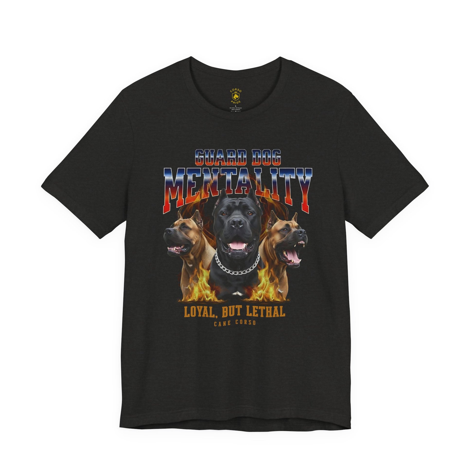 Flame-Style Guard Dog Mentality Artwork Featuring Cane Corso With Bold Metal Typography For Italian Mastiff Lovers, Working Dog Fans, And Breed Pride. For Dog Dad, Dog Mom, Trainer, K9 Handler, Security, Or Protector Breed Fan Who Values Loyalty, Confidence, And Strong Guardian Energy.