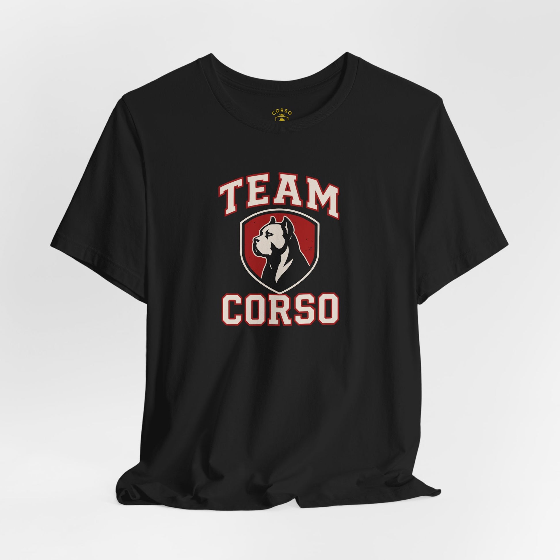 Sporty “TEAM CORSO” design with a varsity-style crest and Cane Corso profile. Bold red/cream/black print that pops on dark tees. A unisex dog-lover shirt for owners, trainers, and fans—perfect for walks, training days, shows, and everyday wear. Great gift for Corso Dad, Corso Mom, breeders, and handlers. Ideal for birthdays, Christmas, and Father’s/Mother’s Day.